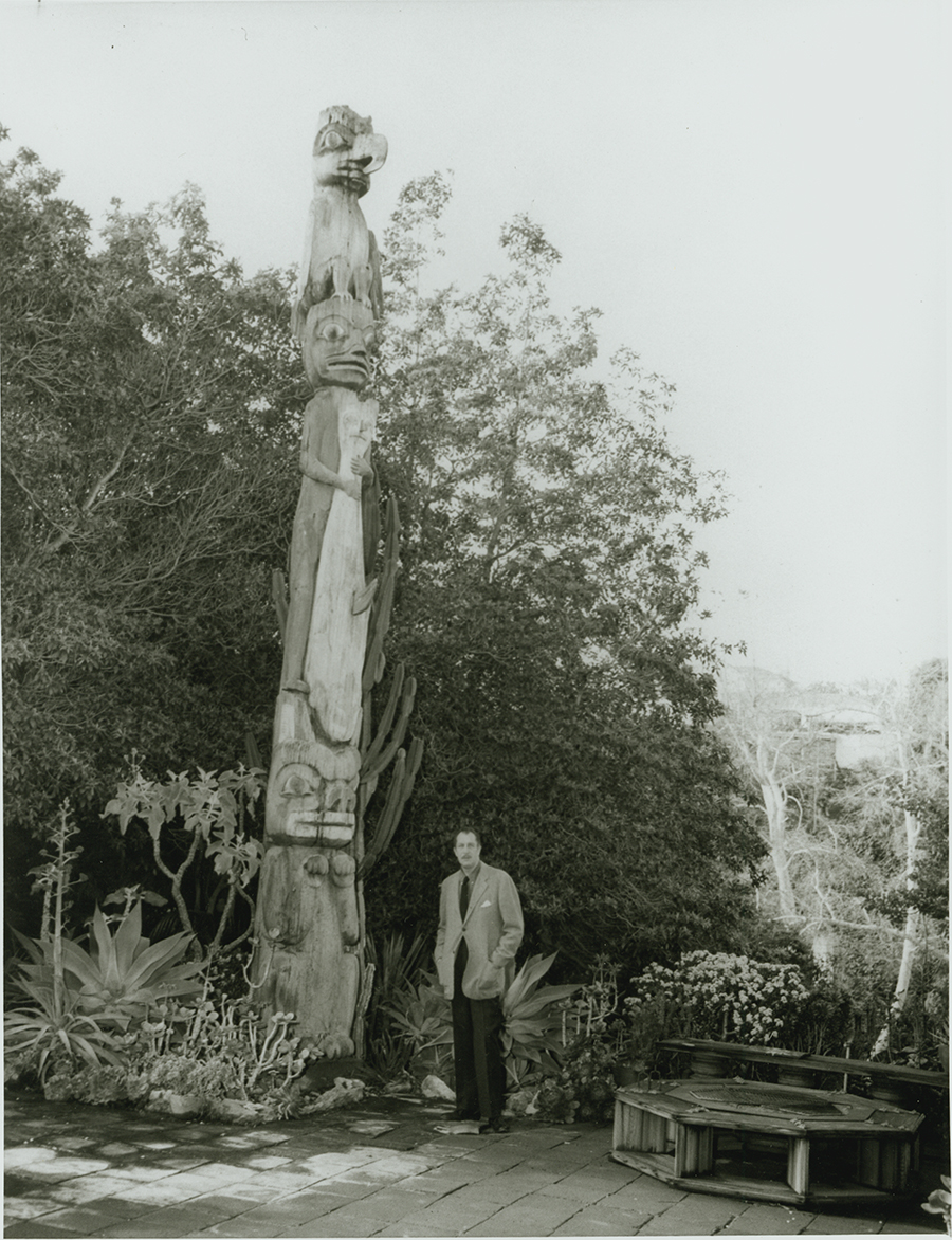 Vincent Price with Tuxecan totem pole, circa 1950. Image courtesy of Ketchikan Museums, KM 77.3.5.443