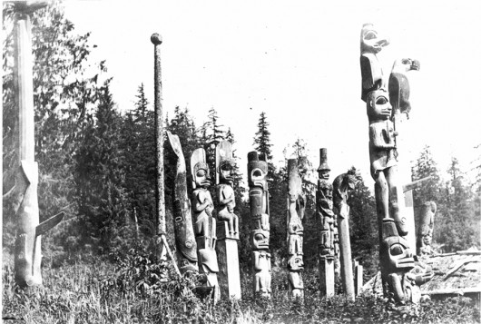 Grave totem poles at south end of Tuxecan village, 1888. George T. Emmons photograph Image courtesy of Ketchikan Museums, KM 77.3.5.450