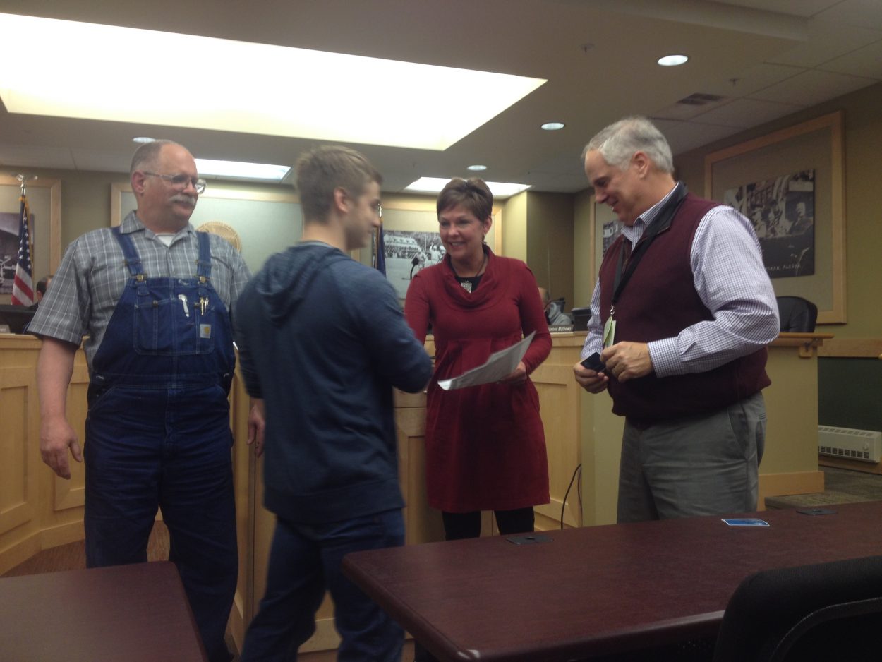 Trevin Tavares receives his NCCER certificate at the Ketchikan School Board meeting January 13, 2016.