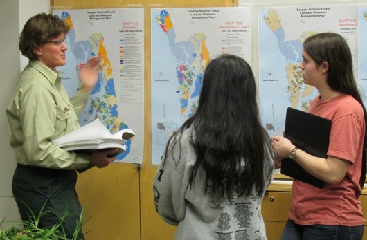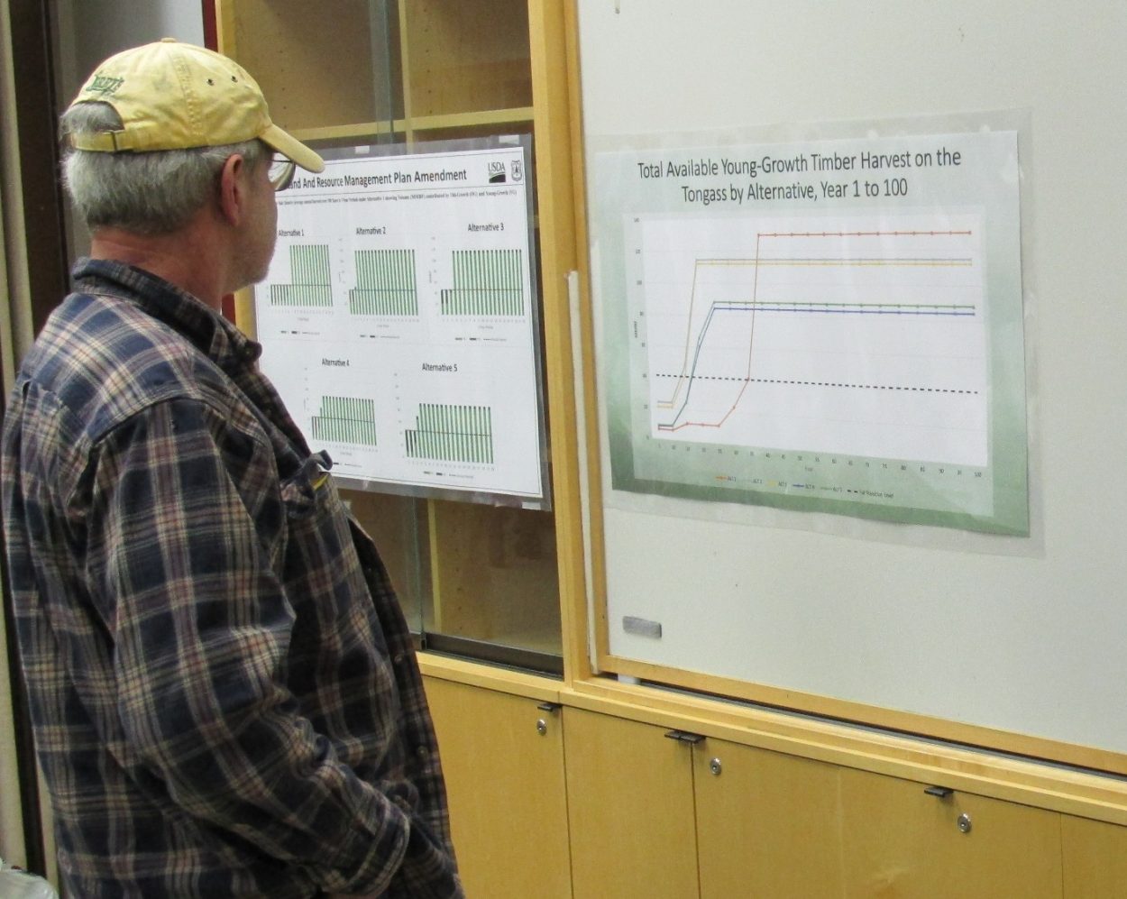 They milled in the Southeast Alaska Discovery Center room, looking at laminated charts pinned to the walls, leafing through handouts detailing the proposed amendment, and listening to Forest Service officials explaining the charts.