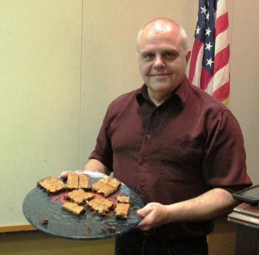 Mayor Lew Williams III with “special” brownies he passed out during his presentation to the Chamber of Commerce. The brownies didn’t contain any cannabis; It was a joke. (Photo by Leila Kheiry)