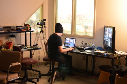 Three camera men and women are court-side filming, all of the cameras feed to a big monitor in a small dark room on the second floor overlooking the gym. Next to the big TV, are two laptop computers, a control board, lots of wires and Austin De-Witt Williams. “I’m on board because I’m the most experienced out of us. Mostly Whicker doesn’t want to be micromanaging us”