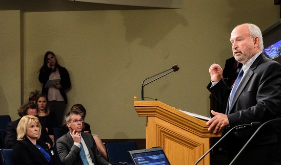 British Columbia Mines and Energy Minister Bill Bennett, at podium, responds to an audit critical of his agency Tuesday in the provincial capital of Victoria. (Photo courtesy B.C. Ministry of Energy and Mines)