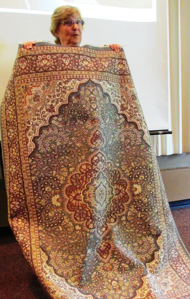 Diane Gubatayao holds up a handwoven rug that she bought during a trip to India with a local Rotary group. (Photo by Leila Kheiry)