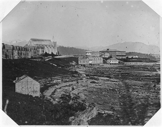 An historic photo of Metlakatla, B.C., with the church in the background. (U.S. National Archives and Records photo – public domain – from Wiki-Commons) Administration.