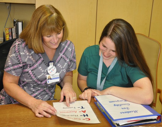 Marguerite Auger, New Horizons activity director, left, and Jessica Tacker, a CNA who is the unit coordinator, are pictured at the New Horizons Long Term Care unit at the Ketchikan hospital. (PeaceHealth photo)