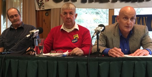 From left, House District 36 candidates Ken Shaw, Bob Sivertsen and Dan Ortiz answer questions during a Ketchikan Chamber of Commerce lunchtime forum. (Photo by Leila Kheiry)