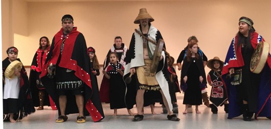 The New Path Dancers perform before Wednesday’s Ketchikan School Board meeting in the Saxman Community Hall. (Photo by Leila Kheiry)