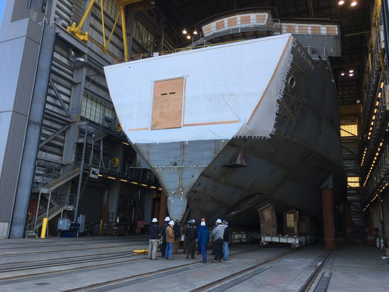 “The second half of the ship will actually go quite a bit quicker because a considerable part of the aft of the ship is already constructed,” he said. “It’s sitting in modules in other parts of the yard. And will be assembled in the assembly hall here over the next eight months. We should be rolling the aft half out early-summer, mid-summer.”