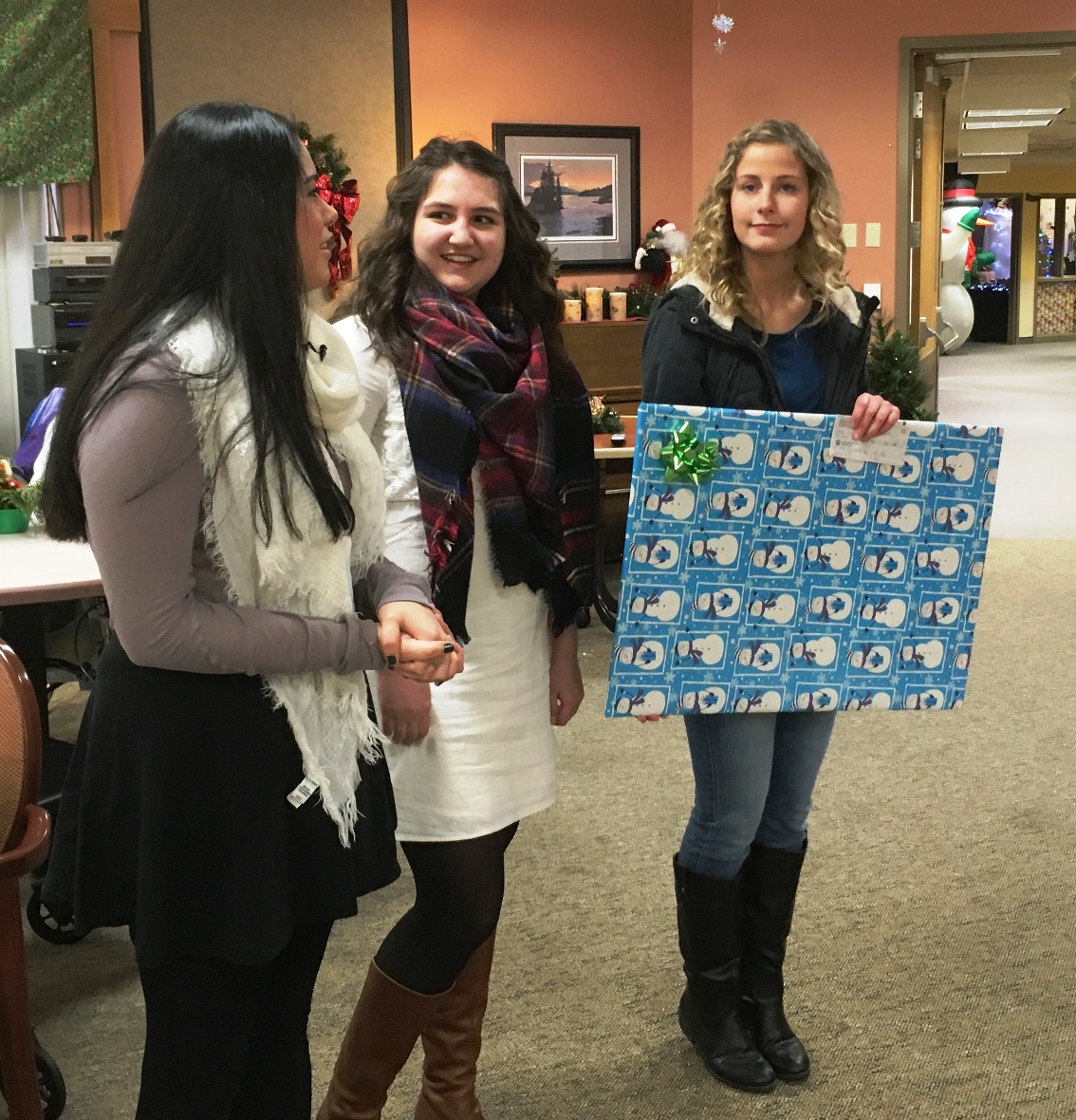Kayhi Interact co-presidents Angie Gomez and McKenzie Harrison, and past-president Alison Blair were all smiles as they presented a gift-wrapped big check – suitable for photos – to members of Ketchikan Pioneers Home’s resident council.