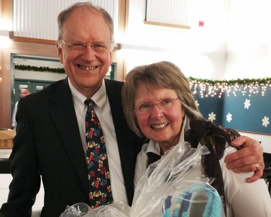 Retiring Doctor David Johnson and his wife, Jenny, are seen at the PeaceHealth Ketchikan holiday party. (PeaceHealth photo)