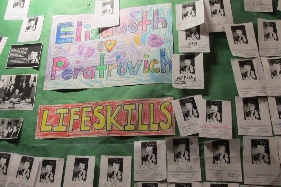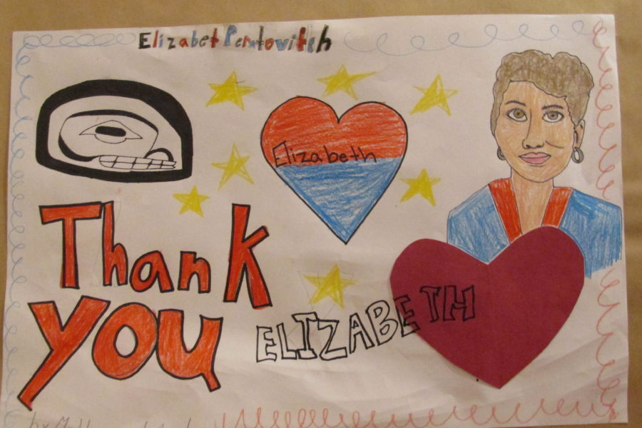 “It starts out at this level where they’re just defining the vocabulary words of caring, respect, courage and kindness. Then it moves to more of the language experience of having the opportunity to tell about Elizabeth Peratrovich in their own words. Of course they don’t write it, but we dictate it. On these they write one word, and it shows that writing has meaning.”