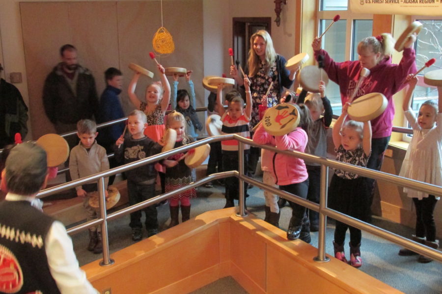 After the film was shown, children from the Pioneer Home and Fawn Mountain IEA Preschools entered singing and drumming.