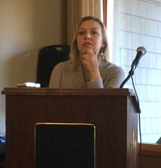 Southeast Conference Board President Chelsea Goucher listens to a comment during the Ketchikan Chamber of Commerce. (Photo by Leila Kheiry)