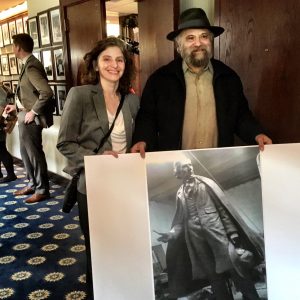 Judith Rubin and her brother, David, show a poster of their statue at a luncheon at the National Press Club. (Photo by Liz Ruskin/APM)