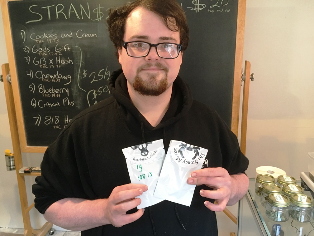 They carefully measured out a gram of Chem Dog, and packaged it up in a secure pouch, then packaged the pre-rolled joint in another pouch. Thayer paid for his purchase, and there it was: The first legal sale in Ketchikan.
