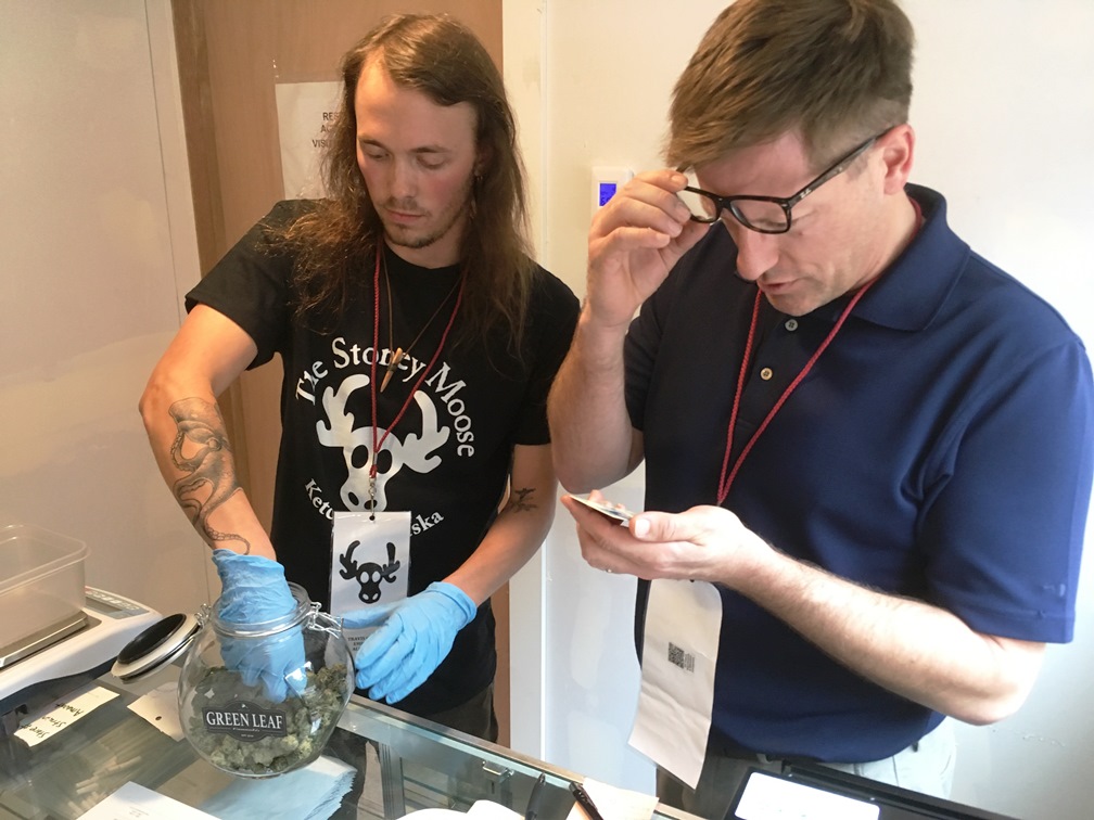 They carefully measured out a gram of Chem Dog, and packaged it up in a secure pouch, then packaged the pre-rolled joint in another pouch. Thayer paid for his purchase, and there it was: The first legal sale in Ketchikan.