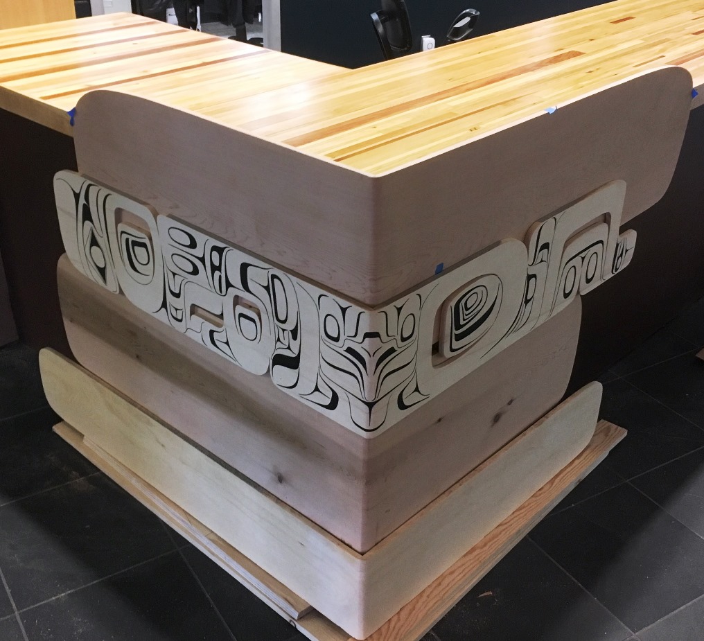 The welcome desk at the renovated Centennial Building features Northwest Coast artistic touches, and locally harvested and milled wood. (Photo by Leila Kheiry)