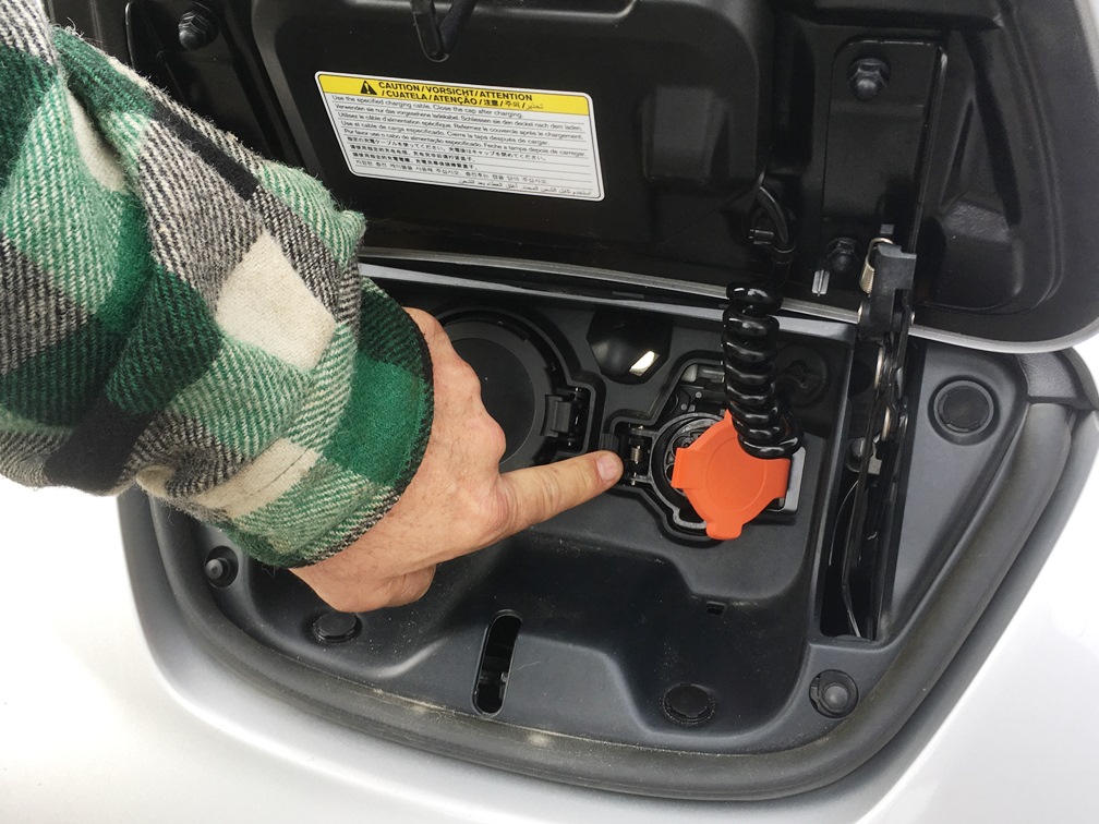 Chris Wilhelm points to the charging portals for his Nissan Leaf, located at the front of the all-electric vehicle. (KRBD photo by Leila Kheiry)