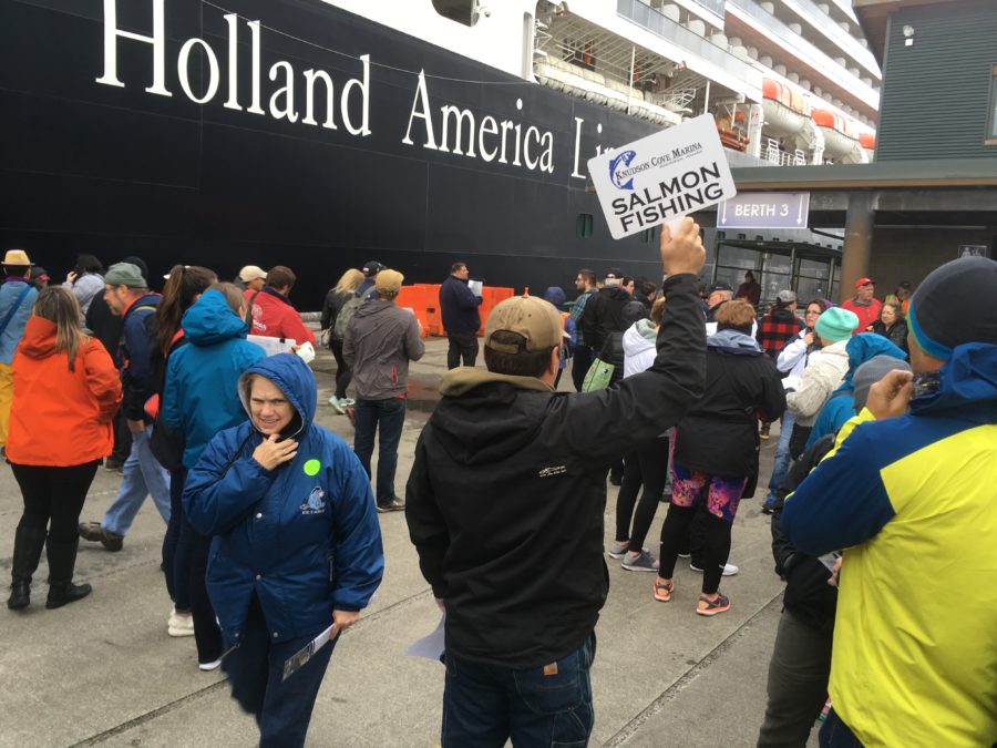 Tour operators hold signs while cruise passengers disembark from the Eurodam. (KRBD photo by Leila Kheiry)