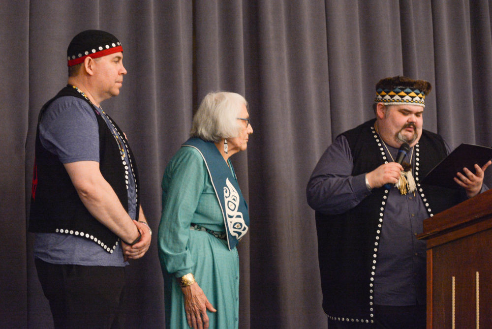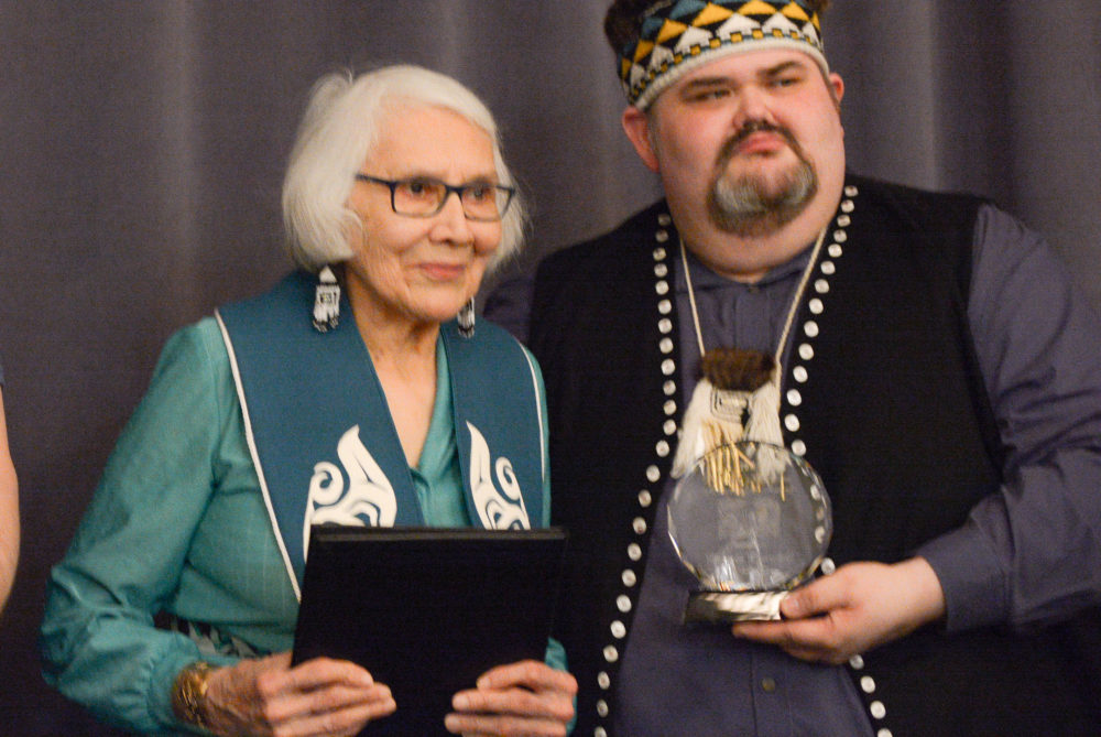 The Central Council of Tlingit and Haida Indian Tribes of Alaska held its 82nd annual meeting last month in Juneau. At the welcoming banquet, Haida master weaver Delores Churchill of Ketchikan received the Lifetime Achievement Award from council president Richard Peterson.