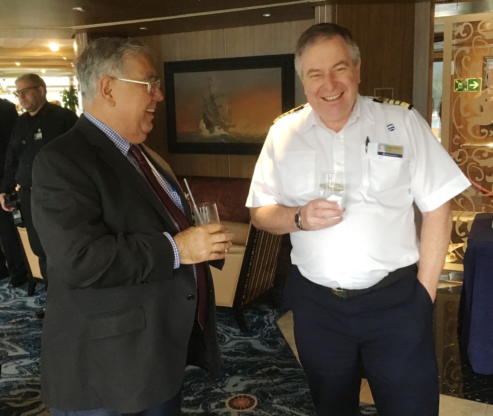 Ketchikan gateway Borough Manager Ruben Duran and Eurodam Captain John Scott talk during an inaugural visit ceremony on board the cruise ship. (KRBD photo by Leila Kheiry)