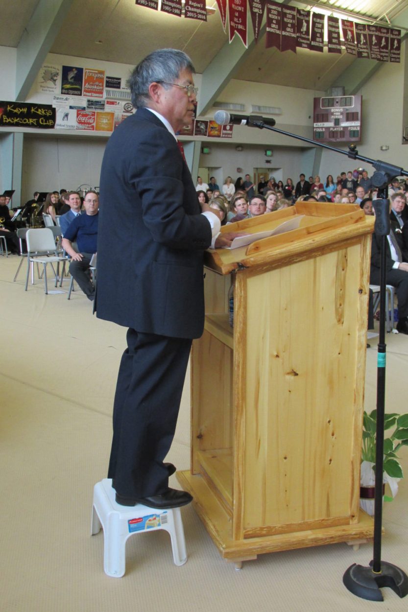 Kayhi principal Bob Marshall introduced commencement speaker Bill Tatsuda, owner and operator of Tatsuda’s IGA. Marshall noted that Tatsuda was named “Heart of the Community” by the Ketchikan Visitors Bureau this year, and is a graduate of Ketchikan High School.