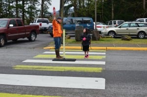 Peter Epler helps a Houghtaling student cross the street safely in 2016. (KRBD file photo by Ruth Eddy)