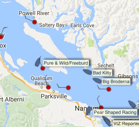 This screenshot shows Team Pure and Wild in the lead Monday in the Race to Alaska. Click the image to go to the online tracker.