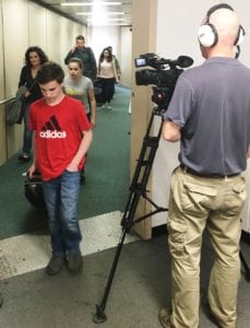 Justin Freeman, right, films Ketchikan residents who volunteered to be part of an anti-drug PSA for the state. (KRBD photo by Emma Atkinson)
