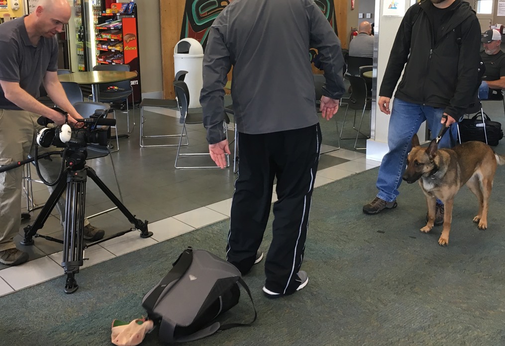 Justin Freeman, left, films a fake drug bust at Ketchikan International Airport for a state PSA. (KRBD photo by Emma Atkinson)
