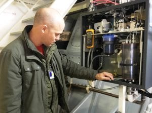 Researcher Wiley Evans checks progress on the “wet box,” where ocean water is filtered and mixed with air to gather carbon dioxide for testing. (KRBD photo by Leila Kheiry)
