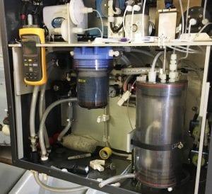 “The water first flows through an oxygen sensor, then through a thermosalinograph, which measures the temperature and salinity of the water, and then into these boxes here, these larger boxes,” he said, pointing to some of the equipment. “The first is the wet box. Water goes into the wet box and is equilibrated with air.”
