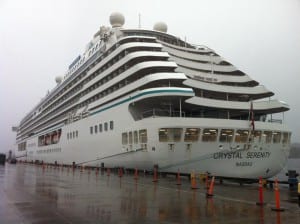 The Crystal Serenity is seen docked at Berth 3 in downtown Ketchikan. (KRBD file photo)