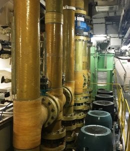 The Zaandam’s emissions filtration system includes seawater scrubbers. (KRBD photo by Leila Kheiry)