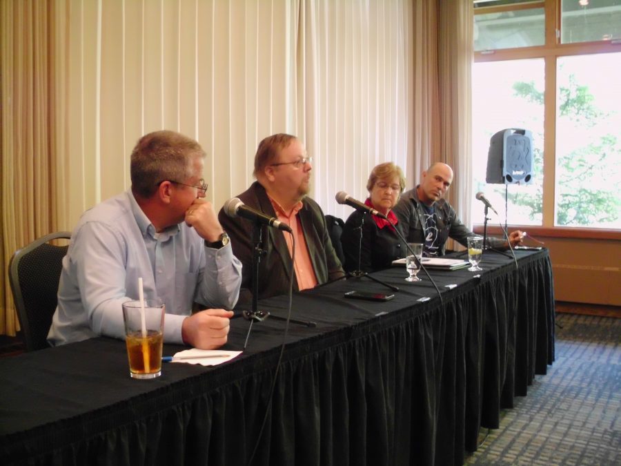 Bill Blankenship, Glenn Brown, Diane Gubatayao and David Timmerman answered questions posed by moderator Michelle O’Brien during the 50-minute forum. Glen Thompson was at Southeast Conference in Haines and unable to attend.