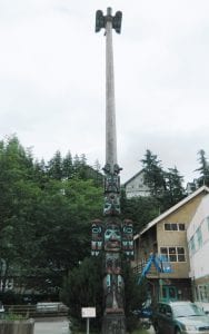 The Chief Johnson pole in downtown Ketchikan. (KRBD file photo)