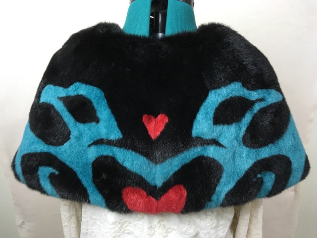 Christy Ruby’s newest piece is called “Taboo Kusax`an (love) Birds.” Here’s the story that goes with this sea otter capelet: “For as far back as we can remember, Alaskan Native Tlingit Indians have descended from either Eagle or Raven clans. My grandmother, Charmain, and her best friend, Marianne, were both from the Eagle Clan. When my grandmother was hundreds of miles away, Marianne taught me about making moccasins, smoking fish, and mixing up soapberry cream. She also loved telling funny stories about her and my grandmother growing up together. When they were young, they both had a crazy crush on a “Raven” clan hottie. They argued a lot about who was going to marry him. Finally my grandmother gave in and said you can have this Raven. Marianne and the Raven dated and her eyes twinkled with love. She decided to make a blanket for him to wear to show off their love. What better design then the Kusax’an (love) birds? That design has always depicted the love of an Eagle and Raven as they peer into each other’s eyes. When she was just about finished, she found out he had cheated on her. She decided to finish the Eagle and Raven with heads looking away in disgust. She gave the finished blanket to him and he wore it not knowing the design was a disgrace. Two weeks later, the Raven came back and threw the blanket in her face. She laughed as hard then, as she did now telling me the story.” (Image and story courtesy Christy Ruby)