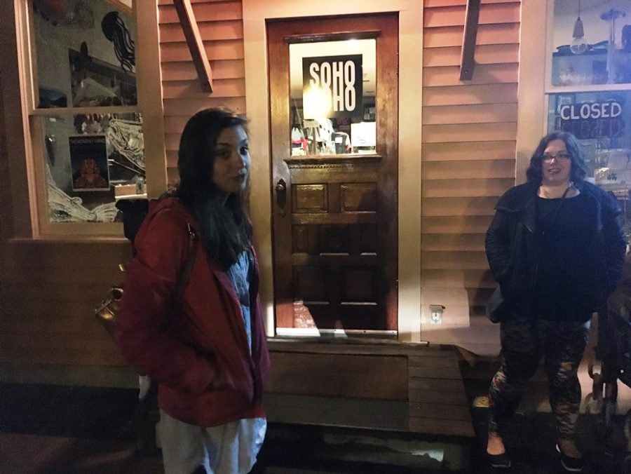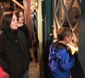 Participants of a recent ghost tour in Ketchikan peer into a reportedly haunted shop on Creek Street. (KRBD photo by Leila Kheiry)