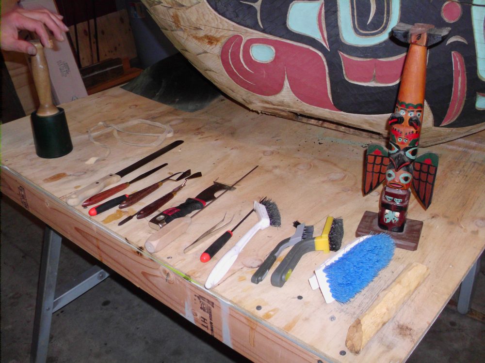 Sitting on the table with the tools is a small replica of the Chief Johnson totem pole. Joseph says it was carved in the 50’s in Ketchikan by a Tsimshian carver.