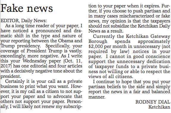 In that letter, Dial expressed concern about what he said is a negative tone in the paper toward President Donald Trump. He wrote that the borough spends about $2,000 a month on public notices published in the Ketchikan Daily News. He wrote, quote “If you choose to push partisan and in many cases mischaracterized or fake news, my opinion is that the taxpayers should not subsidize the Ketchikan Daily News as a result.”
