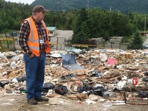 City of Ketchikan Solid Waste Superintendent Lenny Neely stands at the local landfill. He says discarded metal, construction material, bicycles and more are taken out of the dump through the city’s salvage permit program. (KRBD photo by Leila Kheiry)
