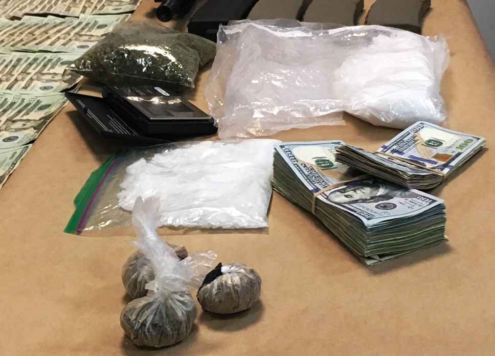 Methamphetamine, heroin and cash seized in a recent drug bust are on display at the Ketchikan Police Department. Drug investigation techniques is one portion of an upcoming Citizen Police Academy. (KRBD file photo by Leila Kheiry)
