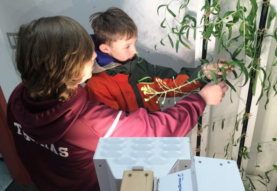 Fawn Mountain Elementary School students Cyress Tibbitts and Declan Thomas check some of the lettuce plants growing in the school’s aquaponics room. (KRBD photo by Leila Kheiry)