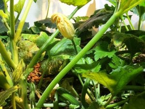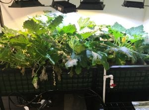 Plants grow in the Fawn Mountain Elementary School aquaponics room. On the table are zucchini, tomatoes, basil and lettuce. (KRBD photo by Leila Kheiry)