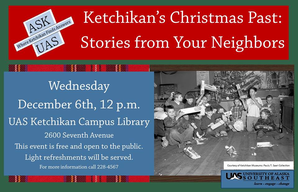 Ketchikan Christmas stories to be shared at UASPosted by Maria Dudzak | Dec 5, 2017Shellie Tabb and Kathy Bolling speak about the next Ask UAS event “Ketchikan’s Christmas Past: Stories From Your Neighbors.” They are hoping people will share stories and learn more about Ketchikan’s history and traditions. https://www.krbd.org/wp-content/uploads/2017/12/AskUASholiday.mp3