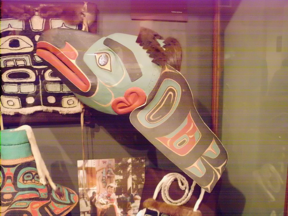 A raven mask, carved by Nathan Jackson, on display in the “Upholding Balance” exhibit at the Tongass Historical Museum (KRBD staff photo by Maria Dudzak).