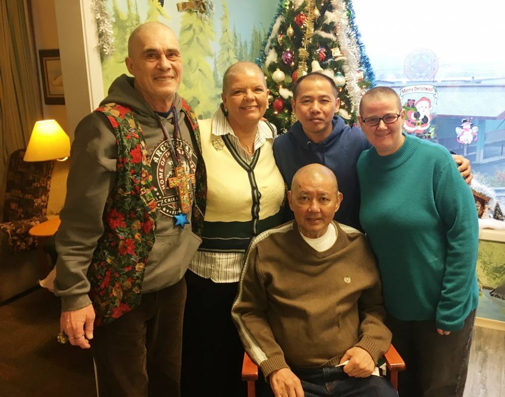 Pictured are some of the people at Rendezvous Senior Day Center who shaved their heads in support of Bobbi Kessinger. From left are Don Harrington, Licha Kelley-King, Phong Nguyen, Kessinger and Virgil Panchle (seated). (KRBD photo by Leila Kheiry)