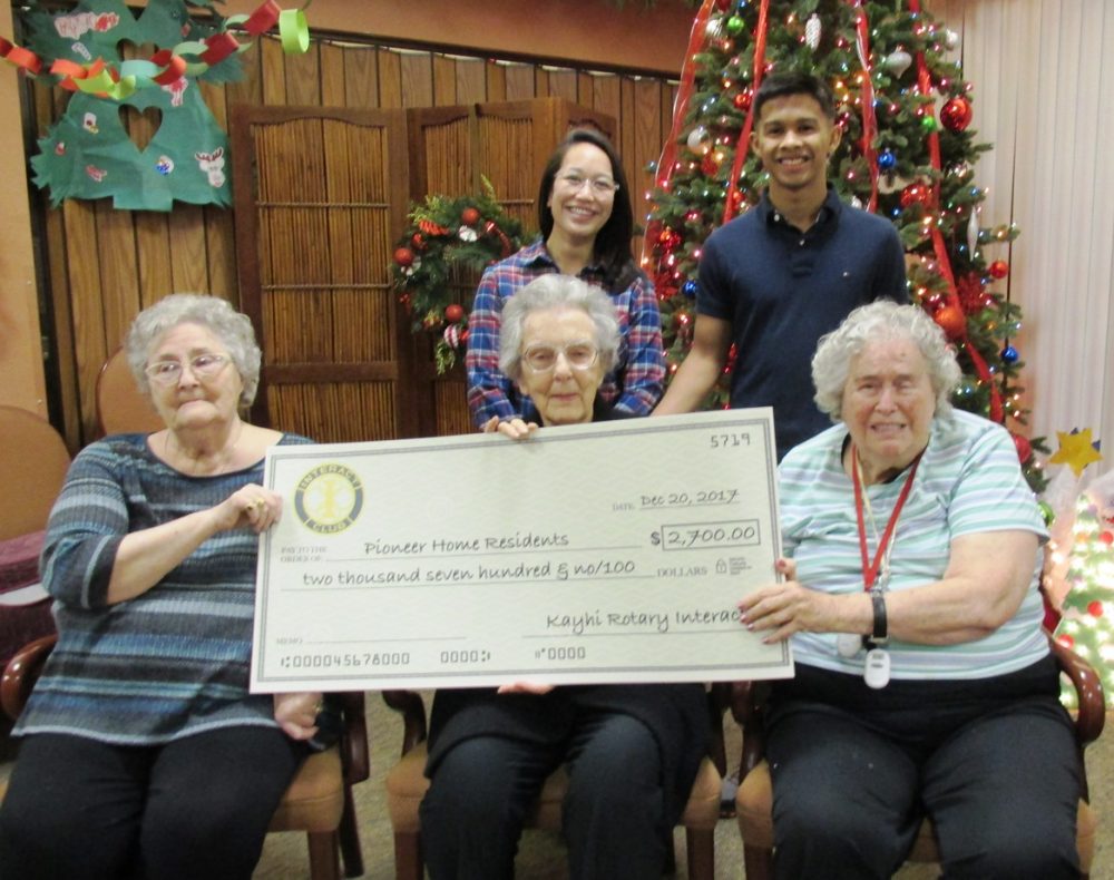 On Wednesday, Vince Tenebrow, co-president of the Ketchikan High School Rotary Interact club, presented a ceremonial check, wrapped in Christmas paper, to residents of the Ketchikan Pioneers Home.