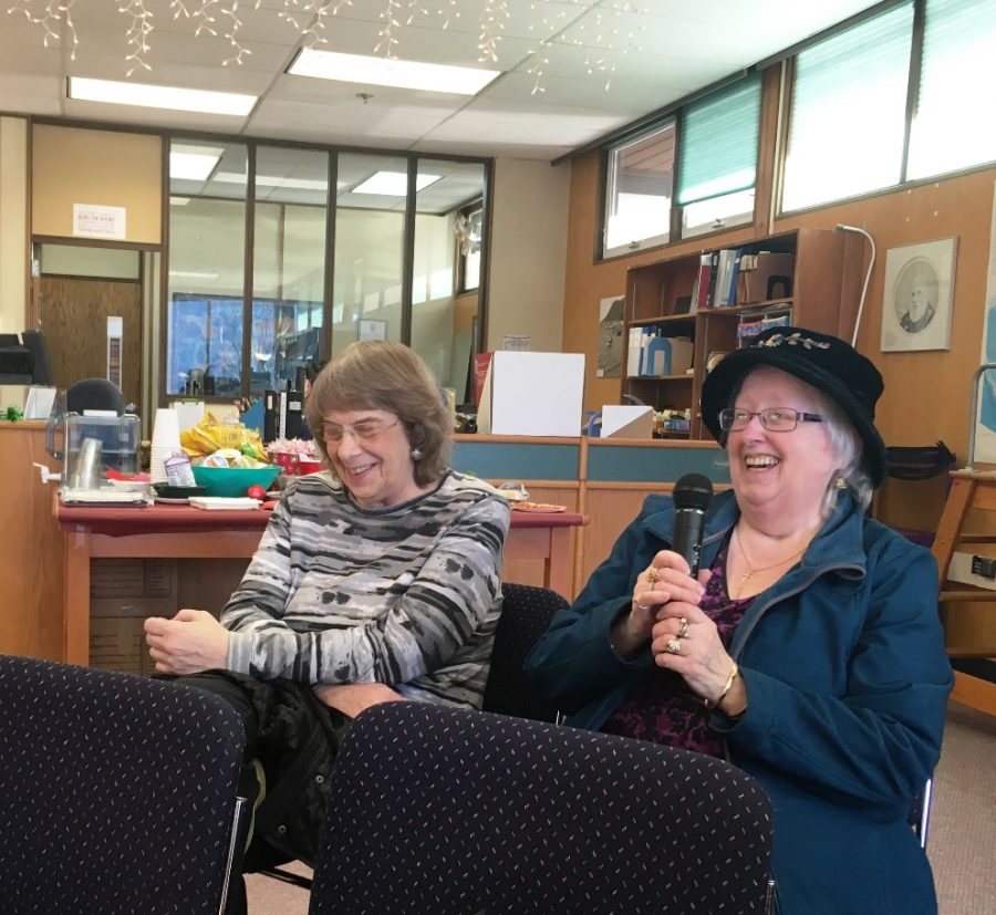 Lynn Clay tells a holiday memory during the December Ask UAS event at the UAS Ketchikan Campus Library. (KRBD photo by Leila Kheiry)